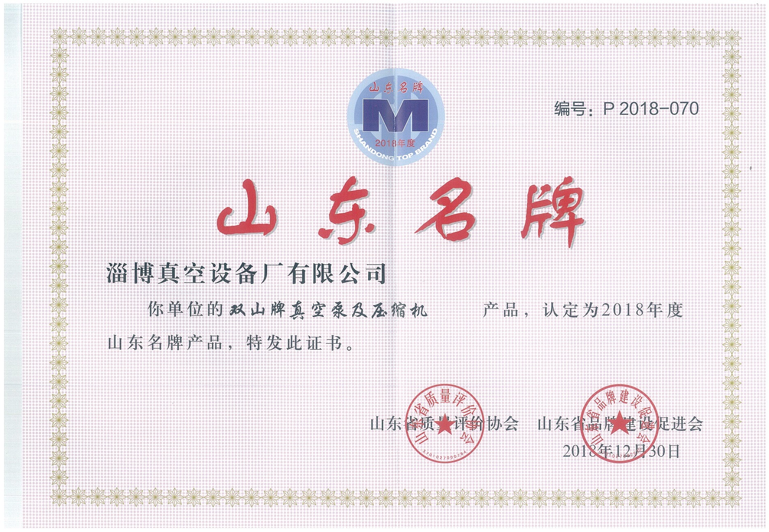 公司生產的“雙山”牌真空泵被山東省質量評價協(xié)會和山東省品牌建設促進會認定為山東名牌