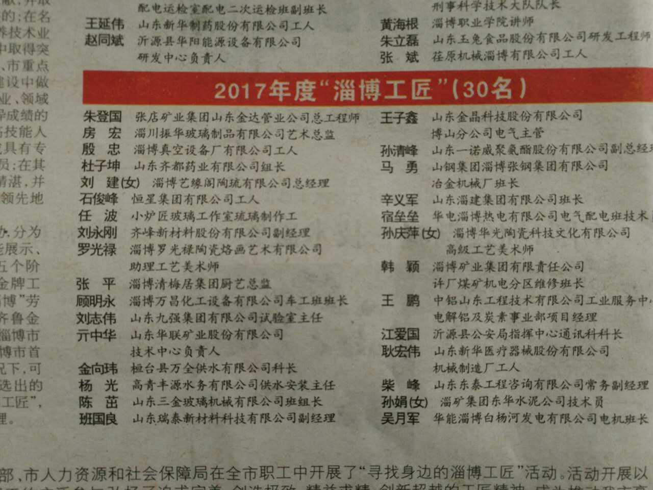 公司一名員工榮獲“淄博工匠”、三名員工榮獲“博山工匠”稱號