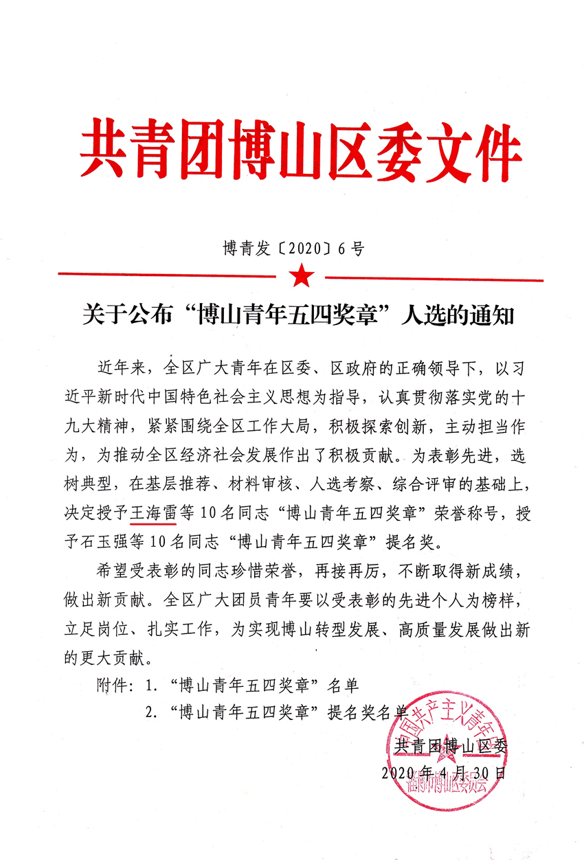 2020年4月30日,共青團淄博市博山區(qū)委員會組織召開了“綻放戰(zhàn)役青春  堅定制度自信”主題宣講暨優(yōu)秀青年事跡分享會。區(qū)委常委、組織部部長楊發(fā)磊,副區(qū)長李林出席會議。會上授予我公司員工王海雷等10名同志“博山區(qū)青年五四獎章”榮譽稱號。